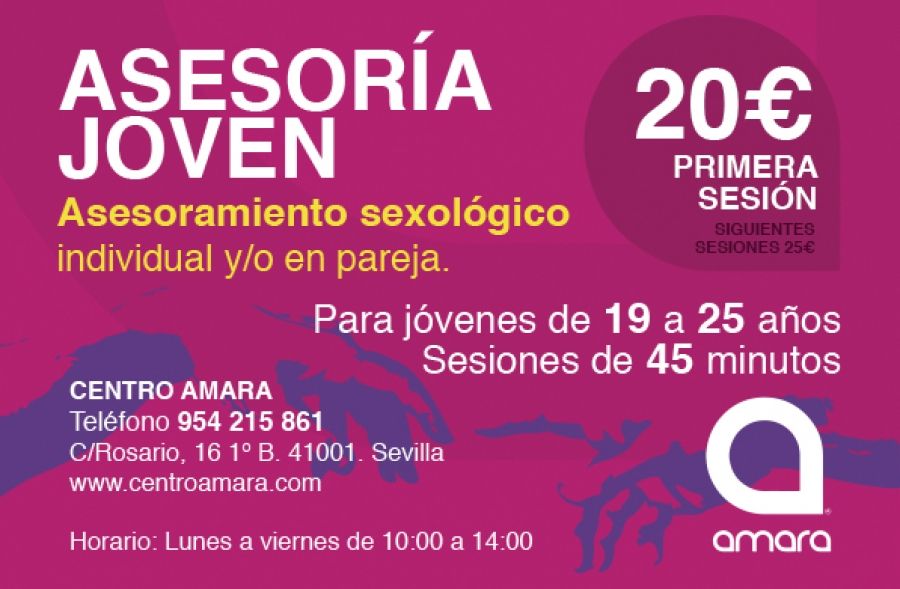 Amara presenta un nuevo servicio de asesoramiento sexológico para jóvenes de 19 a 25 años, individual y en pareja: Asesoría Joven. ¿Por qué vemos necesario un servicio de Asesoría Joven? Las relaciones sexuales son una de las experiencias más profundas, placenteras y que más afianzan el autoconocimiento y la autoestima en la mayoría de las personas. Sin embargo, el mundo afectivo es complejo, tanto mental como físicamente, y junto a la experiencia y la presión social, a menudo puede derivar en dificultades que impiden a la persona disfrutar de la sexualidad en plenitud. Desde hace más de 15 años, en el Centro Amara te ayudamos a comprender las circunstancias que causan esas dificultades y a adquirir herramientas tanto de forma individual como en pareja para superarlas. Las dificultades más comunes entre los y las jóvenes, son: problemas de deseo, dificultad para alcanzar y mantener la erección, dolor asociado a las relaciones sexuales, control de la eyaculación, falta de concentración, miedos y mitos respecto al sexo, orientación sexual del deseo, ansiedad por tener una exagerada expectativa de las relaciones sexuales, dependencia emocional y mitos del amor romántico. En el Centro Amara prestamos ayuda profesional desde el nuevo servicio de Asesoría Joven, ofreciendo sesiones de orientación y/o apoyo en las que poder tratar, de forma efectiva, cercana y económica, cualquier aspecto que esté interfiriendo en el disfrute de la sexualidad ya sea de forma individual o en pareja. Pide tu cita en el 954 215 861 de lunes a viernes de 10 a 14 horas. Centro Amara c/ Rosario 16, 1º B 41001 Sevilla www.cetroamara.com